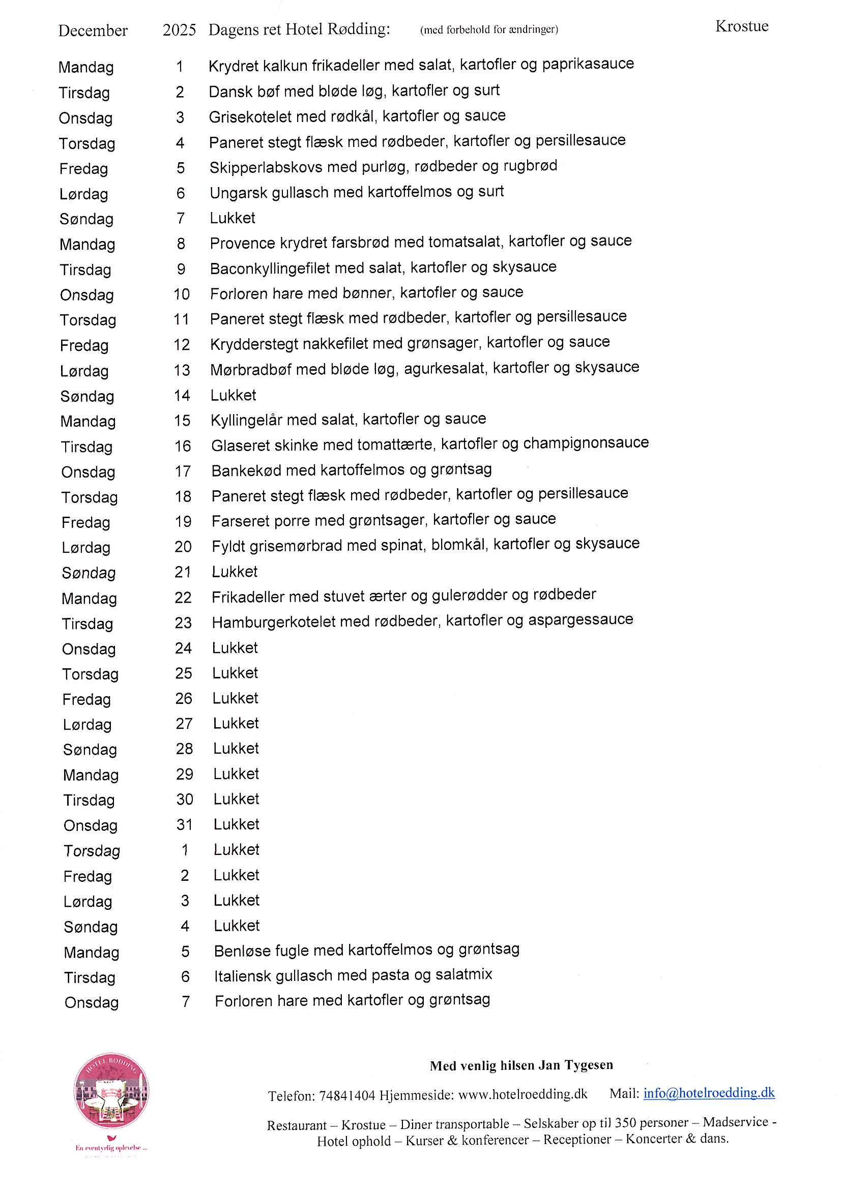 Dagens ret kan nydes i Krostuen eller hjemtages ved afhentning i Krostuen.